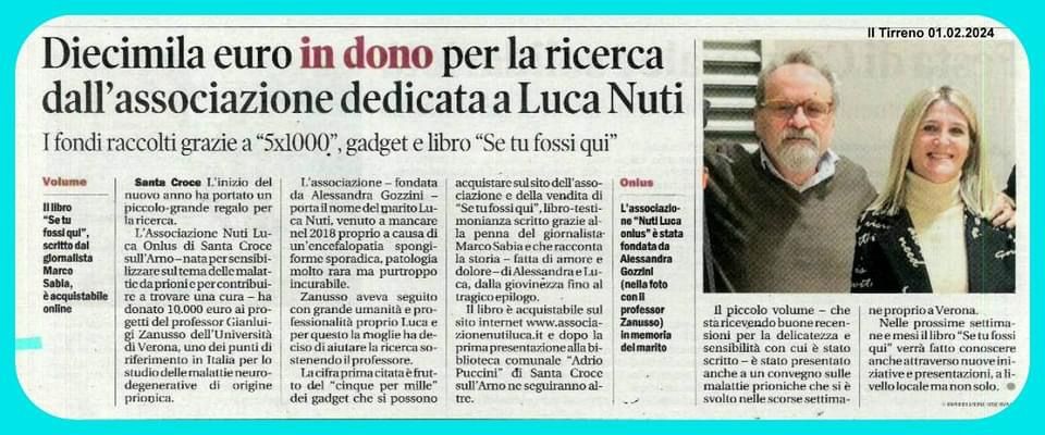 Il 14 marzo 2019, presso il Bar Giannini in Piazza Matteotti a Santa Croce sull'Arno dalle ore 19,00 in poi verrà realizzata la raccolta fondi dell'Associazione Nuti Luca Onlus per la ricerca delle malattie Neurodegenerative di origine Prionica.
