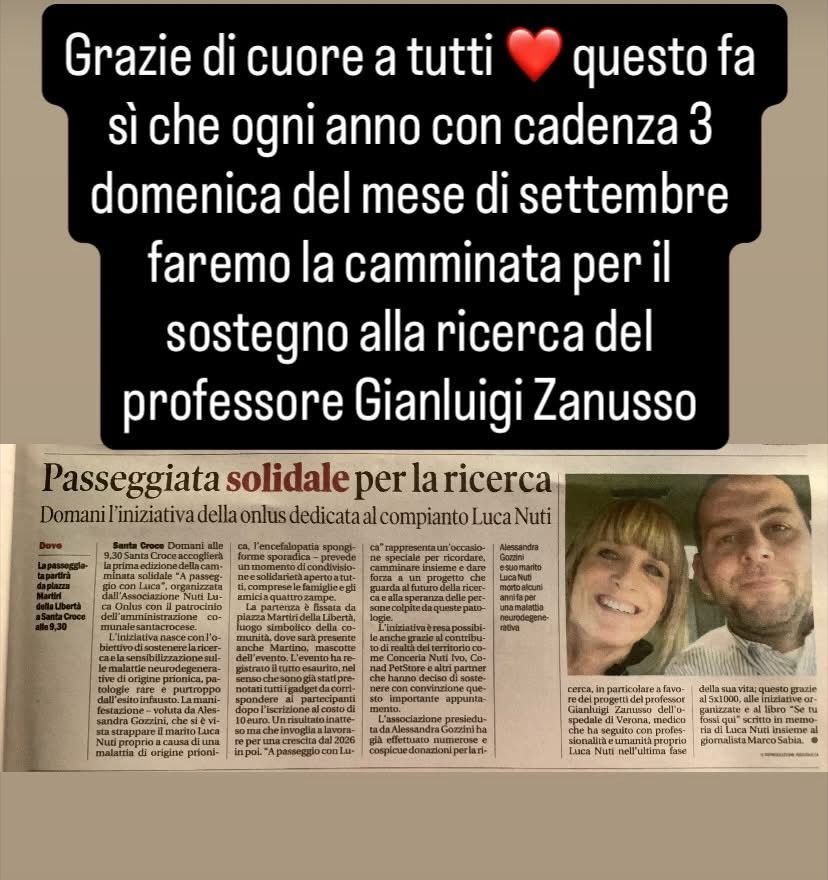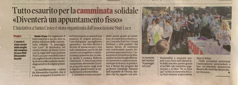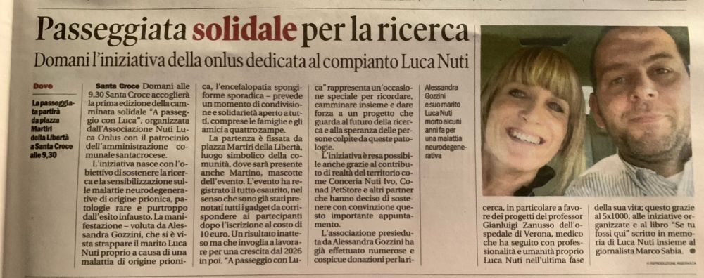 Il 21 settembre 2025 si è svolta la prima edizione della camminata solidale nel centro storico di Santa Croce Sull'Arno "A passeggio con Luca". Tutto esaurito e anche oltre al tal punto che diventerà un appuntamento fisso la terza domenica del mese di settembre di ogni anno per sostenere e raccogliere fondi a favore della ricerca sulle malattie neurodegenerative di origine prionica. La manifestazione ha visto decine e decine di santacrocesi e non solo camminare per le vie del centro con magliette e zainetti a tema (presente per un saluto anche il Sindaco Roberto Giannoni). E visto il successo inaspettato come già detto un appuntamento fisso con cadenza terza domenica del mese di settembre. L'iniziativa è stata resa possibile anche grazie al contributo di realtà del territorio come la Conceria Nuti Ivo, Conad, PetStore e altri partner che hanno deciso di sostenere con convinzione questo importante appuntamento. L'associazione Nuti Luca presieduta da Alessandra Gozzini ha già effettuato numerose e cospicue donazioni per il sostegno per la ricerca, in particolare a favore dei progetti del professor Gianluigi Zanusso dell'ospedale di Verona, medico che ha seguito con professionalità e umanità proprio Luca Nuti nell'ultima fase della sua vita: questo grazie al 5X1000, alle iniziative organizzate e al libro "Se tu fossi qui" scritto in memoria di Luca Nuti insieme al giornalista Marco Sabia. Nelle prossime settimane l'associazione provvederà a fare un'ulteriore donazione diretta alle ricerche del professor Zanusso.