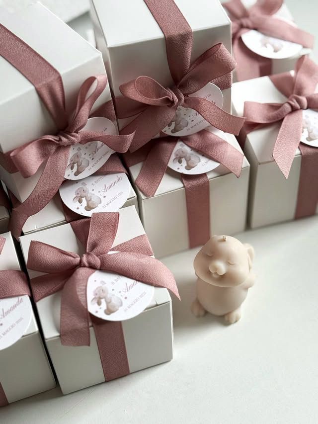 La bomboniera viene inviata confezionata ed è disponibile nei colori rosa, celeste, avorio, rossa, blu o verde.